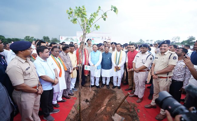 पूंजीपथरा थाना परिसर में मातृ-छाया उपवन हेतु वृक्षारोपण कार्यक्रम में कृषि मंत्री, वित्त मंत्री, सांसद सहित स्कूली ब