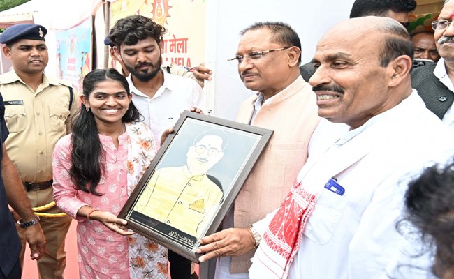 रायपुर। मुख्यमंत्री श्री साय को राजधानी रायपुर के शंकर नगर स्थित बीटीआई ग्राउंड में आयोजित दिव्य कला मेला में कलाकार सुश्री हीरा धृतलहरे ने अपने हाथों से बनाई पैरा शिल्प पो