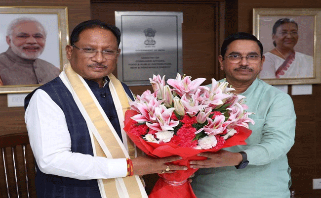 रायपुर। मुख्यमंत्री श्री विष्णुदेव साय ने आज नई दिल्ली में केंद्रीय खाद्य, उपभोक्ता मामले एवं नवीन और नवीकरणीय ऊर्जा मंत्री श्री प्रल्हाद जोशी से सौजन्य भेंट की।