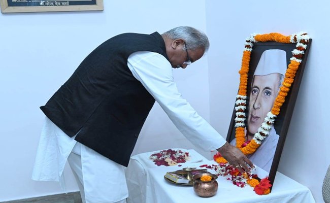 रायपुर। मुख्यमंत्री श्री भूपेश बघेल ने आज यहां अपने निवास कार्यालय में भारत के प्रथम प्रधानमंत्री भारत रत्न पंडित जवाहर लाल नेहरू की जयंती पर उनके छायाचित्र पर पुष्प अर्पित