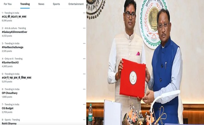 रायपुर। छत्तीसगढ़ का बजट आज एक्स पर ट्रेंड में पहले स्थान पर रहा। पांच बजे तक इस संबंध में 6 हजार 196 पोस्ट किये जा चुके थे। मुख्यमंत्री श्री विष्णु देव साय सरकार ने इस बजट का थीम