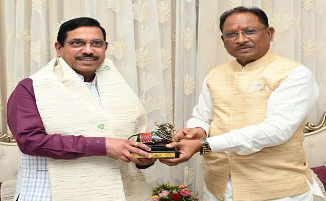 रायपुर। मुख्यमंत्री श्री विष्णुदेव साय ने आज शाम नया रायपुर स्थित अपने निवास कार्यालय में केंद्रीय खाद्य मंत्री श्री प्रहलाद जोशी का आत्मीय स्वागत किया। इस अवसर पर मुख्यमं