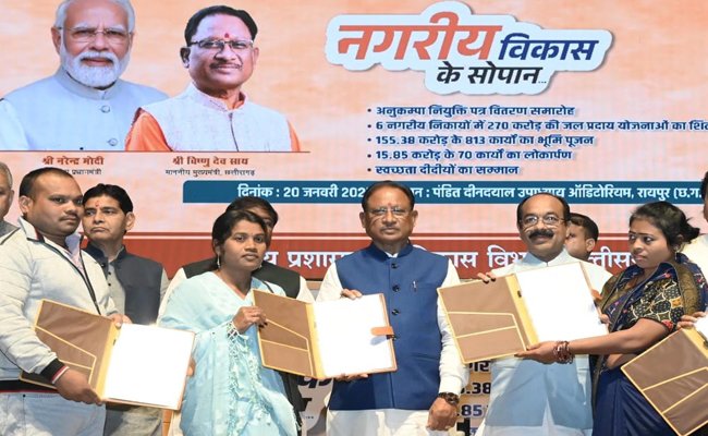 मुख्यमंत्री नगरीय विकास के सोपान कार्यक्रम में हुए शामिल : मुख्यमंत्री श्री विष्णु देव साय ने 103 परिजनों को सौंपें अनुकम्पा नियुक्ति पत्र
