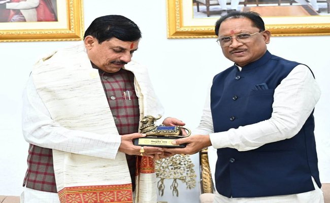 रायपुर। मुख्यमंत्री श्री विष्णु देव साय ने आज यहां अपने निवास में मध्यप्रदेश के मुख्यमंत्री डॉ मोहन यादव का आत्मीय स्वागत किया। डॉ. यादव छत्तीसगढ़ राज्य स्थापना की 24वीं वर्षग