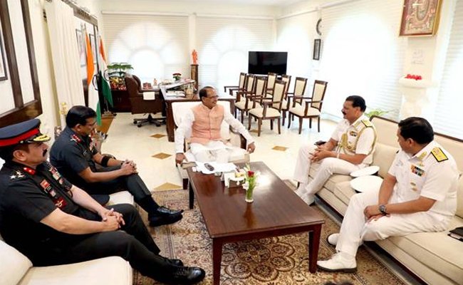 भोपाल। मुख्यमंत्री श्री शिवराज सिंह चौहान से वेस्टर्न नेवल कमांड के वाइस एडमिरल श्री दिनेश के त्रिपाठी, 21 कॉर्पस के लेफ्टिनेंट जनरल विपुल सिंघल, रीयर एडमिरल समीर सक्सेना, और