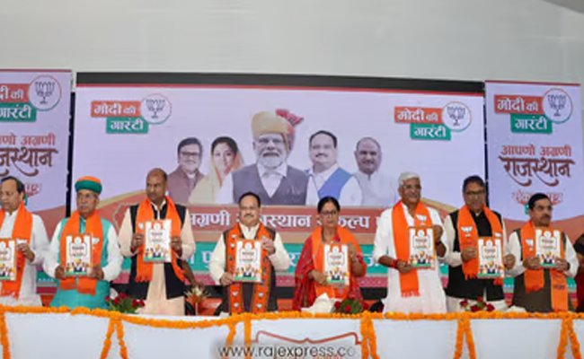 जयपुर। भारतीय जनता पार्टी ने राजस्थान विधानसभा चुनाव के लिए अपना घोषणापत्र (संकल्प पत्र) गुरुवार को जारी किया। जिसमें युवाओं को पांच साल में 2.50 लाख सरकारी नौकरी देने का वादा क