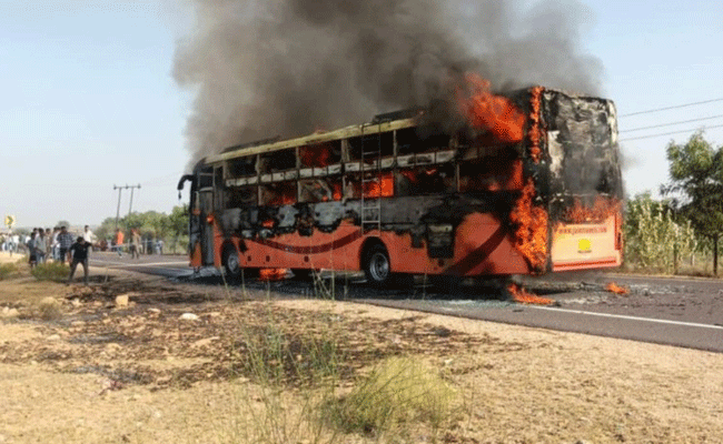 जैसलमेर। राजस्थान के जैसलमेर में जैसलमेर-जोधपुर हाईवे मंगलवार दोपहर 3.30 बजे चलती एसी स्लीपर बस में आग लग गई। देखते ही देखते आग ने भीषण रूप ले लिया। बचने के लिए लोग चलती बस से कूद
