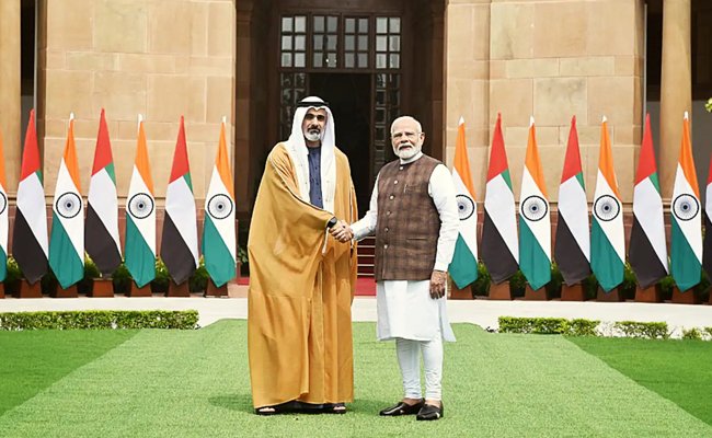नई दिल्ली। प्रधानमंत्री नरेंद्र मोदी ने सोमवार को अबू धाबी के क्राउन प्रिंस शेख खालिद बिन मोहम्मद बिन जायद अल नाहयान के साथ बैठक की। हैदराबाद हाउस में हुई इस बैठक के दौरान दो
