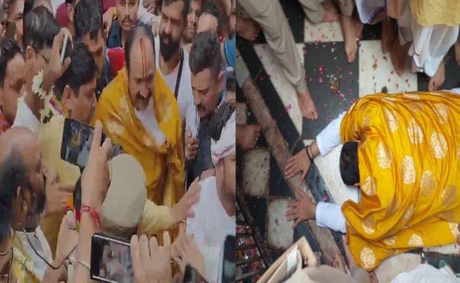 नई दिल्ली। श्रीराधा रानी पर अमर्यादित टिप्पणी के बाद विवादों में आए कथावाचक पंडित प्रदीप मिश्रा अचानक बरसाने पहुंचे। मंदिर के द्वार पर कथावाचक प्रदीप मिश्रा ने नाक रगड़कर म