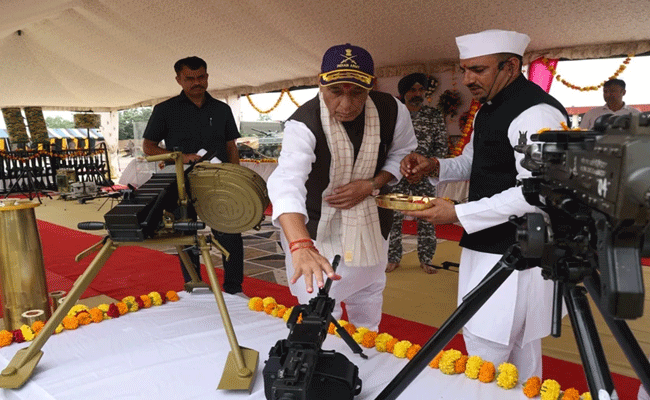 नई दिल्ली। केंद्रीय रक्षा मंत्री राजनाथ सिंह ने गुरुवार को दशहरे पर भुज में एक मिलिट्री बेस का दौरा किया। यहां L-70 गन डिफेंस सिस्टम समेत शस्त्र पूजा से पहले सैनिकों को संबोधित